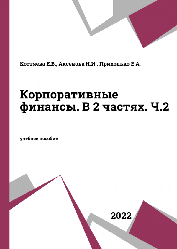 Корпоративные финансы. В 2 частях. Ч. 2 : учебное пособие / Костяева Е. В., Аксенова Н. И., Приходько Е. А. - Новосибирский государственный технический университет, 2022. -ISBN 978-5-7782-4794-9 (ч. 2), 978-5-7782-4792-5 .