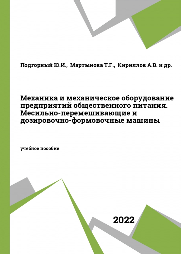 Механика и механическое оборудование предприятий общественного питания. Месильно-перемешивающие и дозировочно-формовочные машины : учебное пособие / Подгорный Ю. И., Мартынова Т. Г., Кириллов А. В. [и др.]. - Новосибирский государственный технический университет, 2022. - ISBN 978-5-7782-4844-1 .