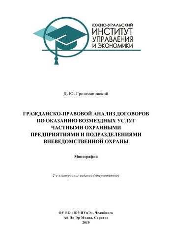 Гражданско-правовой анализ договоров по оказанию возмездных услуг частными охранными предприятиями и подразделениями вневедомственной охраны : монография / Гришмановский Д. Ю. - Южно-Уральский институт управления и экономики, Ай Пи Эр Медиа, 2019. -