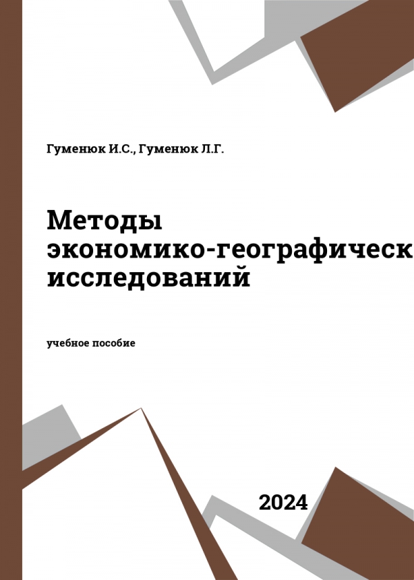 Методы экономико-географических исследований : учебное пособие / Гуменюк И. С., Гуменюк Л. Г. - Балтийский федеральный университет им. Иммануила Канта, 2024. -ISBN 978-5-9971-0903-5 .