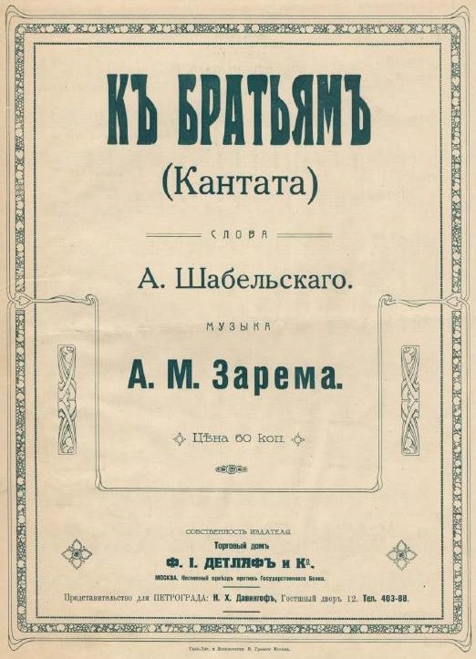 К братьям. «Всколыхнулась Русь могучая…»: (кантата). Для голоса с фортепиано / Зарема А. М. - Российская национальная библиотека, 1915.