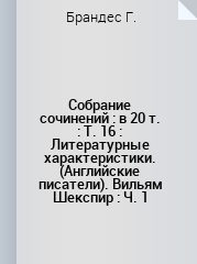 Брандес, Г. Собрание сочинений : в 20 томах / Г. Брандес ; составитель М. В. Лучицкая ; перевод с датского М. В. Лучицкой. — 2-е изд., испр. и доп. — Санкт-Петербург : Невская ЦБС, 1909 — Том 16 : Литературные характеристики. (Английские писатели). Вильям Шекспир : Ч. 1 — 1909. — 442 с.