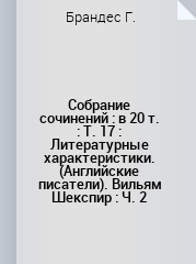 Брандес, Г. Собрание сочинений : в 17 томах / Г. Брандес ; составитель М. В. Лучицкая ; перевод с датского М. В. Лучицкой. — 2-е изд., испр. и доп. — Санкт-Петербург : Невская ЦБС, 1910 — Том 17 : Литературные характеристики. (Английские писатели). Вильям Шекспир : Ч. 2 — 1910. — 340 с.