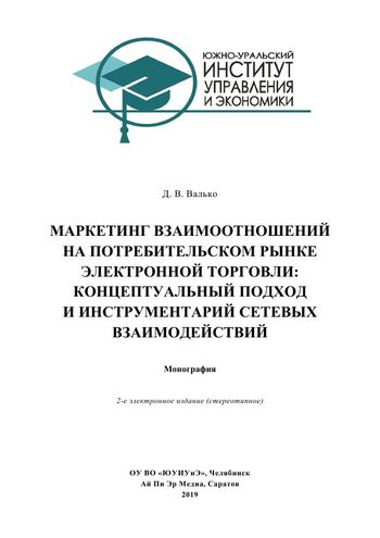 Маркетинг взаимоотношений на потребительском рынке электронной торговли: концептуальный подход и инструментарий сетевых взаимодействий : монография / Валько Д. В. - Южно-Уральский институт управления и экономики, Ай Пи Эр Медиа, 2019. -