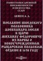 Памятники древней письменности и искусства. 165. Послание Шведского полковника Александра Лесли к царю Михаилу Федоровичу из Нарвы о новоучрежденном рыцарском Польском ордене в 1638 году / А. Левен. - Санкт-Петербург : Типография И. Н. Скороходова, 1906. -