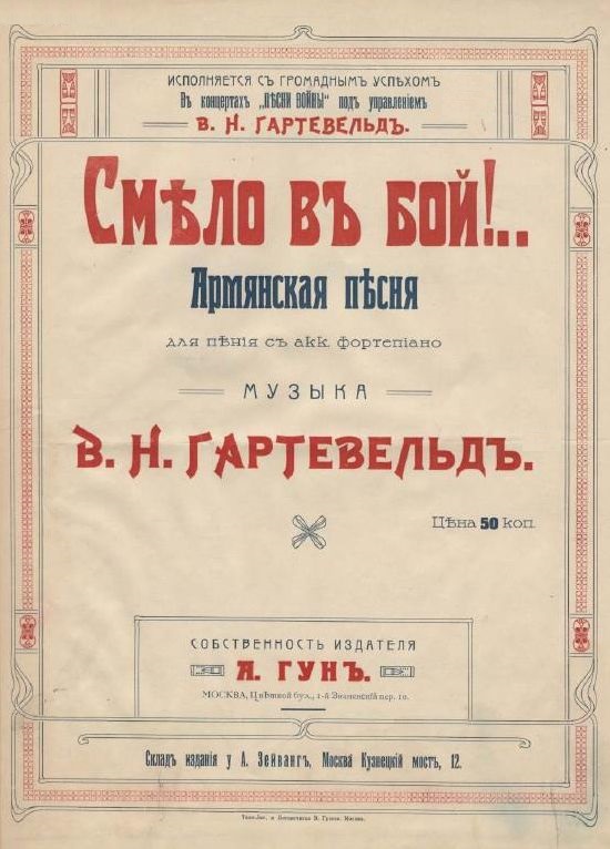 Армянская песня «Смело в бой!... ». Из цикла «Песни войны» для пения с акк[омп.] фортепиано / Вильгельм Наполеонович Гартевельд. - Российская национальная библиотека, 1914.